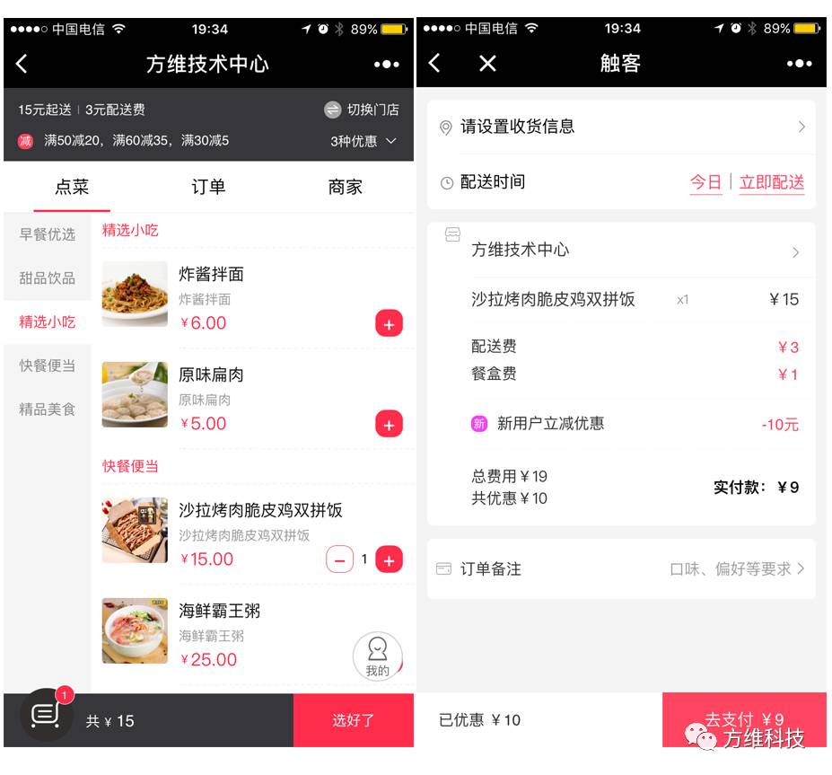 用戶可通過(guò)附近的小程序進(jìn)入外賣小程序門店,進(jìn)行點(diǎn)餐、結(jié)算,支持使用積分、余額,還可查看訂單和商家信息。